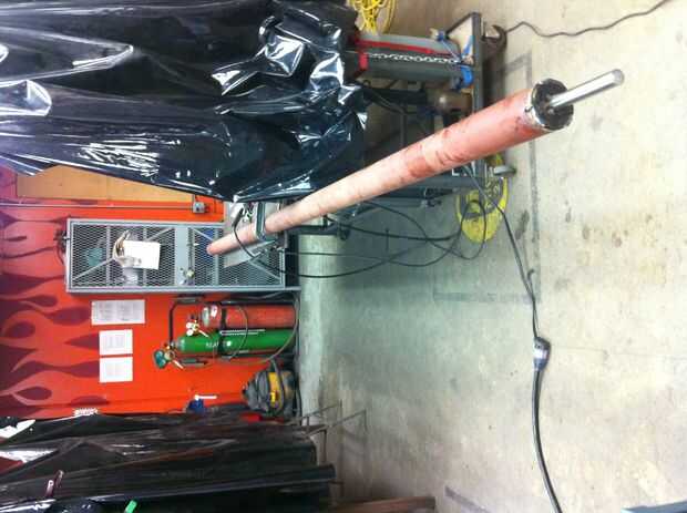 primero soldó con autógena las placas en el eje, luego presiona en el tubo de 3.5"(piensa en martillo) y después soldado con autógena de la placa externa al eje. Un calibrador del dial en el extremo demostró sobre.01 hacia afuera.