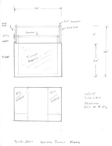 aquí es un bosquejo de la vista lateral. la estructura de tubos es 14' largo para acomodar un tubo de 12'. Utiliza 3.5" conducto atado con unistrut para crear los capítulos. el tejido del túnel se muestra dentro (del marco exterior arriba) tiene que ser bastante rígida - y sugiero usar 3/8 capas como pura (inferior).