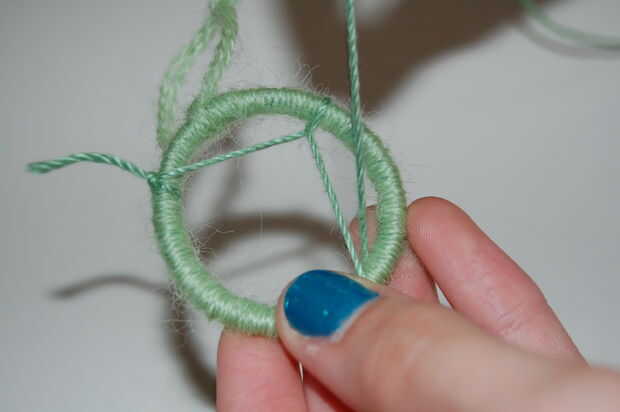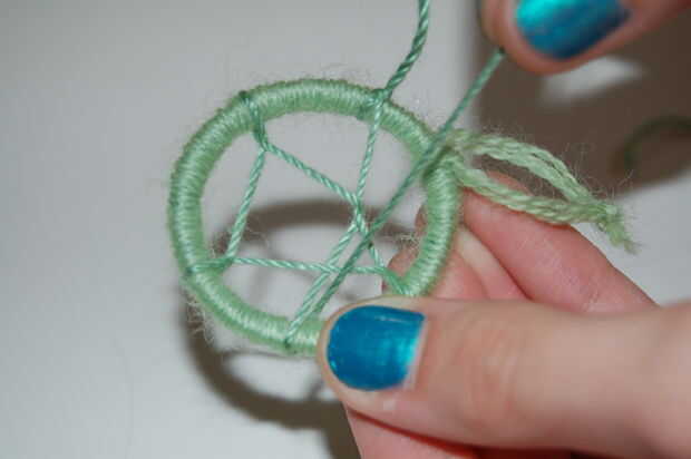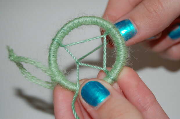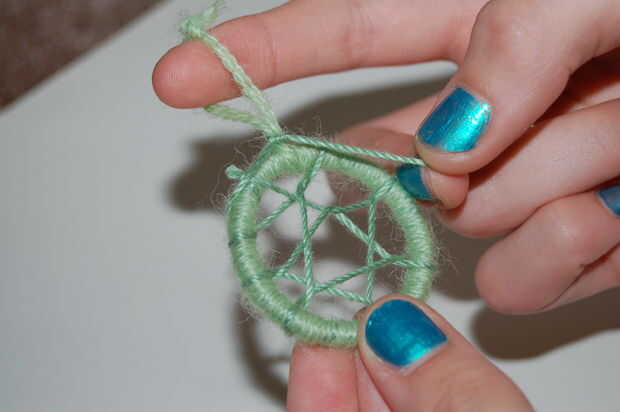 Esto puede conseguir muy confuso si no sabes lo que estás haciendo. Aquí están tejiendo la cuerda, el nuevo que acaba de agregar, en todo el cuadro excepto un espacio en el medio. Este espacio tendrá un cordón colgando hacia abajo en él. Trate de hacer que se vea como un real cazador de sueños. Traté de mostrar tantas imágenes como sea posible, esperemos que ayude. Si ayone termina uno, me encantaría ver fotos!