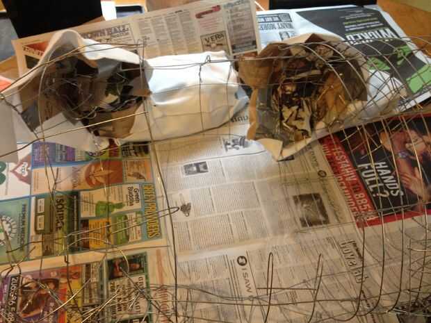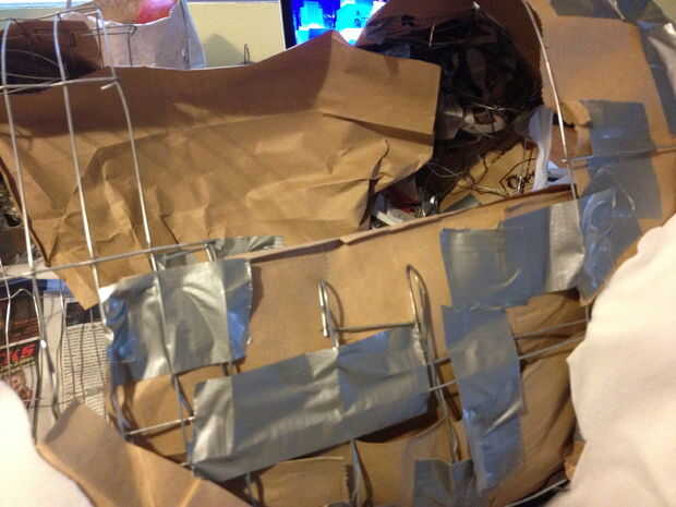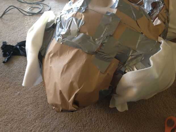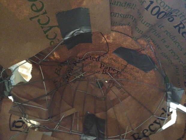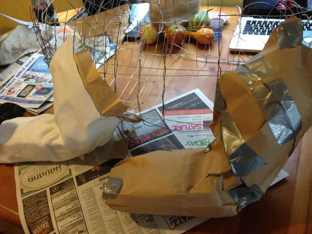 -Luego tendrá que cubrir todo el cuerpo con papel que actuará como piel de Falcor. Usé el corte encima de bolsas de papel. Conducto con cinta adhesiva al esqueleto de alambre.