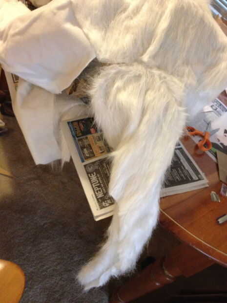 -Para la cola, hice una forma de cilindro con la piel blanca y había afilada en el extremo. Utilicé una combinación de pegamento de spray y pasadores de seguridad para entrar a la cola en su forma. Pinté los pasadores de seguridad con blanco hacia fuera para que no vean. Asegúrese de que hace la cola bastante corta que no arrastre en el piso.
