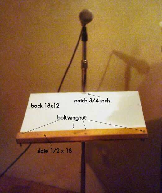 hice los primeros 18 x 20, con muescas de 3/4 de pulgada en la parte superior para que no se mueva, 4 orificios en la parte inferior 2 por lo que son capaces de mantener la pizarra superior y los otros 2 van a la otra pieza de 3 x 20 en la parte inferior Coloque la pieza inferior para el soporte de mike, luego sujete la parte superior Tornillo todos juntos y hay que ir sencilla un atril y mike soporte todo en uno , Espero que esto ayude, si no hago claro como yo lo siento, yo no soy un buen maestro en todo.