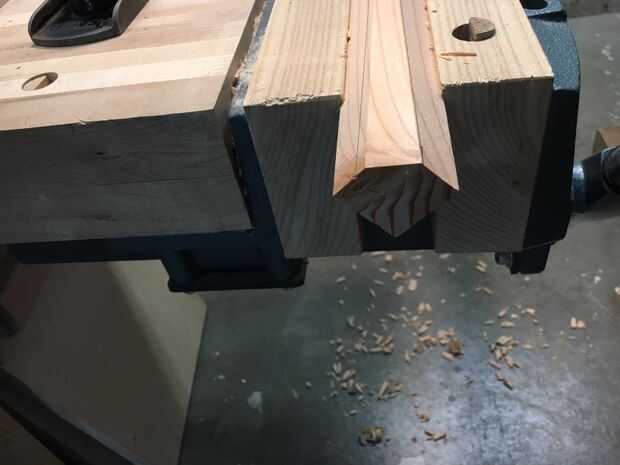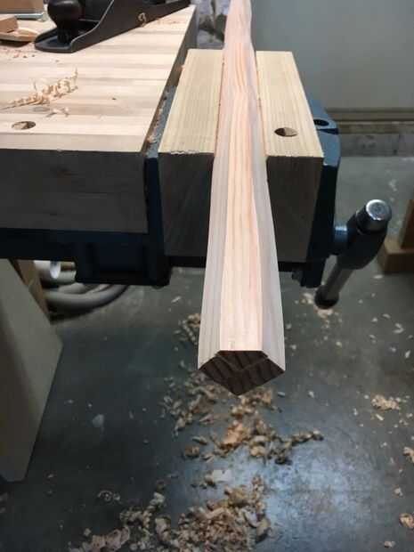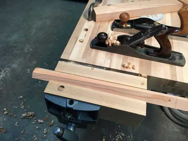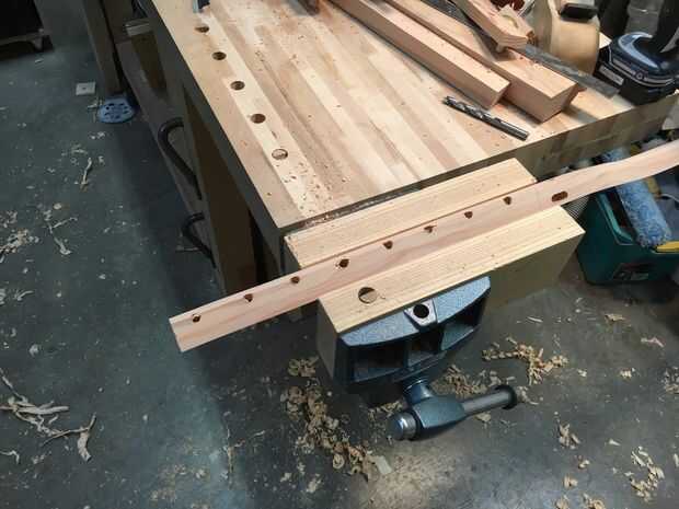 Quería que el soporte de estante/música ser ajustables por lo perforé una serie de agujeros en las parte superior 12 pulgadas o menos de la pata delantera. En primer lugar, necesitaba una superficie plana en la parte delantera y la parte posterior de la pierna que era fácil de hacer con un plano de la mano. Es un corte cónico a partir del punto de enganche de la pierna y va hacia la parte superior.