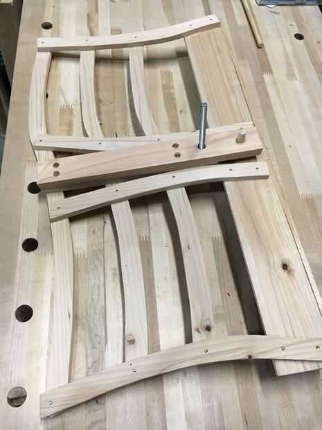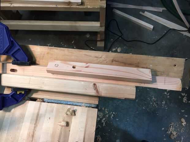 Corté un trozo de madera de 12 "x 1 1/4" x 5/8" y pegado en una espiga de 3/8". Perfore un orificio de 2" por encima de la espiga. Después de la perforación del primer agujero en la pierna en la parte inferior insertar la espiga en el agujero y perfore a través del otro agujero en la pierna. Repetir este proceso hasta la parte superior de la pierna. La pieza de madera con la espiga obtiene unida a la parte posterior del soporte del estante/de la música con los tornillos después de avellanar la cabeza del perno.