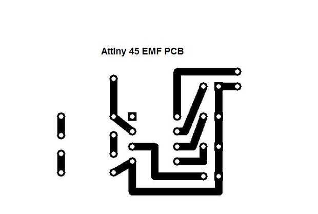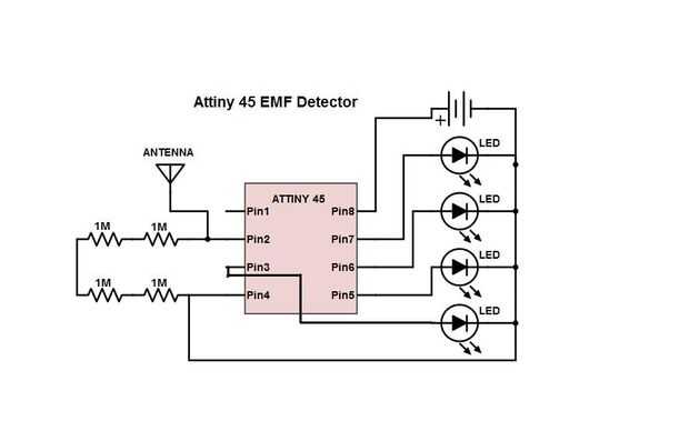 Empezar por conectar uno de entradas analógicas de los Attiny 45 a la antena y tierra utilizando cuatro resistores de 1 mega ohm en serie, después de que las salidas restantes del alambre a la luz cuatro led de. Utilicé un alambre de cobre sólido para la antena y envuelto alrededor de un marcador para la primavera como la bobina. Parece funcionar con 3 voltios, así que utilicé un soporte de la batería AAA para energía. Recomiendo construirlo en un protoboard inicialmente para que puedas ver lo que funciona mejor para su antena y modificar el circuito o el código según sea necesario.