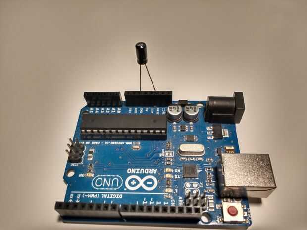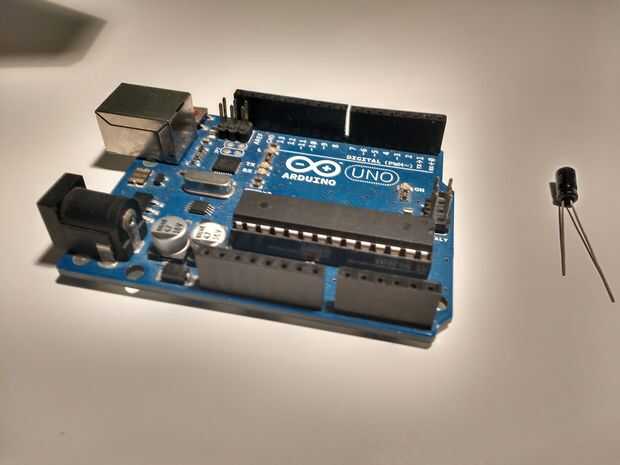 1. Este paso requiere el uso de un arduino uno para actuar como programador para el chip del attiny. Usted también necesitará un condensador electrolítico de 10 uf