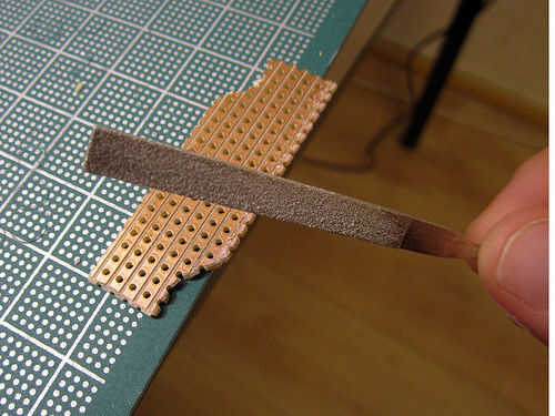 Cortado un trozo de placa de circuito perforada a la medida (véase la ilustración) y lime los filos.