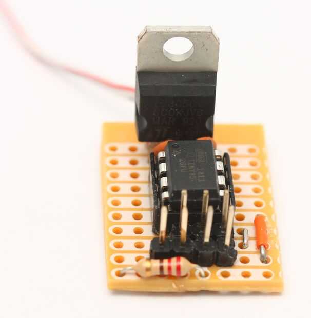 El cerebro es un chip ATTiny 85 con el PB0 (pin 5) conducir el pwm para el servo y la PB1 conectado a la alarma.