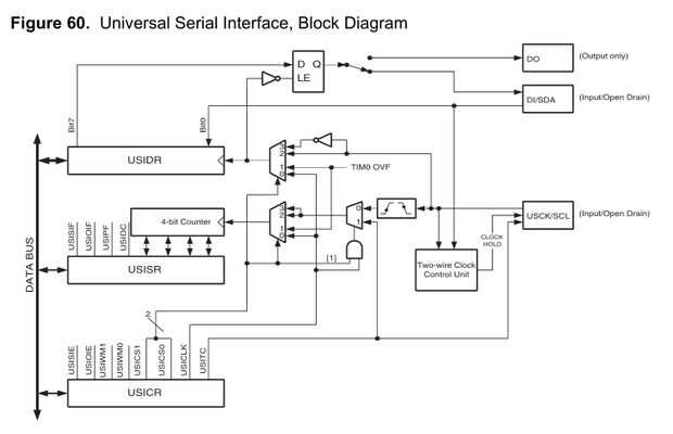 No entraré en detalle en cada uno de los pedacitos en cada uno de estos registros, pero si quieres escribir algo de código de USI es esencial que usted Lea estas secciones de la hoja de datos. Recomiendo leer el todo Universal interfaz Serial - sección USI (páginas 142-150 de la hoja de datos completa del ATTiny2313). Esto le dará toda la información que usted necesita además de lo he señalado aquí.