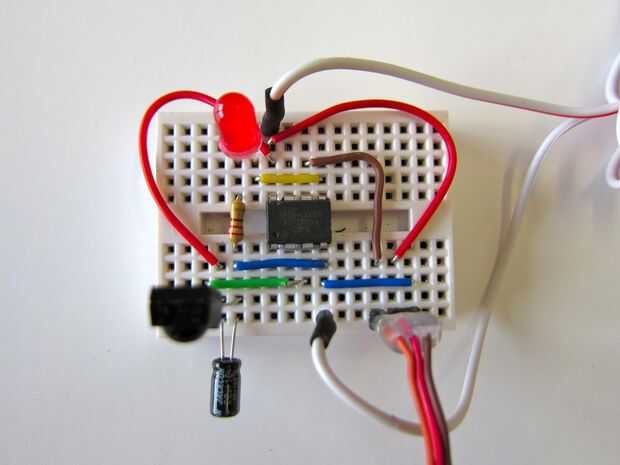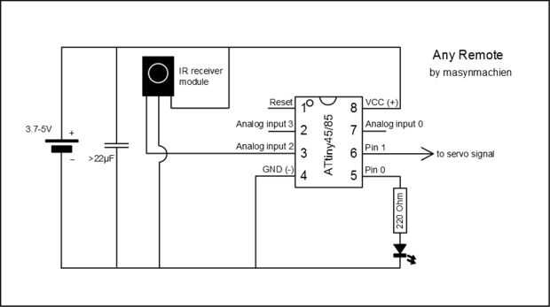 Mientras que experimentar para reducir el proyecto de Zappelin Arduino a un ATtiny hice una instalación de mando a distancia simplificado. Cuando cualquier señal de infrarrojos es recogido, es decir sin comprobar cualquier código para determinar qué control remoto utiliza o botón que se presiona el servo realiza una acción.