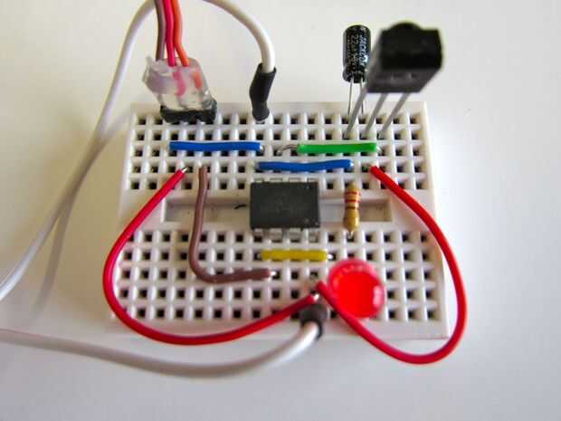 Los controles de microcontrolador ATtiny el la señal de un módulo de receptor de infrarrojos. Los filtros de ese módulo. El módulo de receptor IR automáticamente se encarga de limitar la recepción de señales moduladas a 38 kHz (o cerrar), típico para controles remotos de TV y aplicaciones relacionadas (en realidad, cuando se toman fotografías noté también reacciona a un flash).