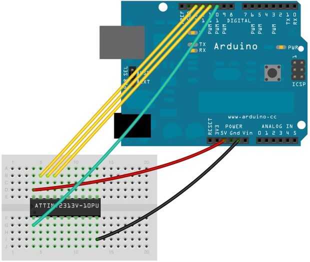Google me dio una idea como programar el ATTINY2313. Solo tenemos que programar el arduino como un ISP, hacer algunas conexiones y subir el programa a la 2313. Mi programa no era grande en todo teniendo en cuenta el hardware diseñado y la operación marcados en la tabla de verdad.