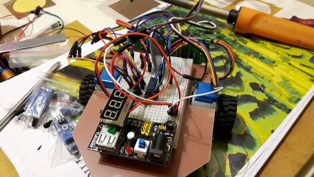 Aquí he querido presentar un bosquejo de la robusteza del vehículo. El corazón del robot es el microcontrolador ATtiny2313. Coche robot son los 2 motores paso a paso. La inspiración para la construcción de mi robot fueron otros proyectos. En la mayoría de los casos son proyectos basados en el Arduino y servomotores. En mi caso no utilizo la plataforma Arduino.