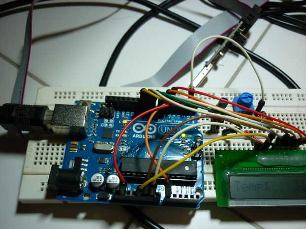 El circuito fue construido inicialmente en el Arduino Uno durante el período de desarrollo de código y luego cambié las clavijas para adaptarse a utilizado en el Attiny84, que aún funciona sin problemas en la ONU.