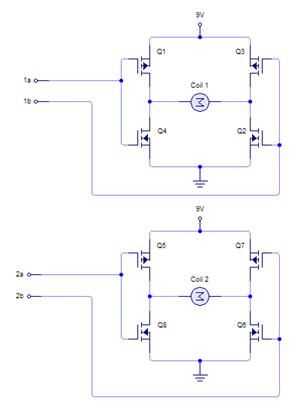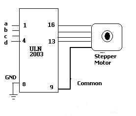 Todos 4 de ellos tienen que ir a una matriz de transistores. TIP120 es una buena idea, o un ULN2003 que contiene 7 Darlington transistores (como el TIP120) capaz de 500 mA cada uno. Se trata de un circuito común y usted puede encontrar fácilmente. He añadido uno. A, b, c, d el ir a la 6,7,2,3. Utilizar algunos "ensayo y error" para el pedido de conexión.