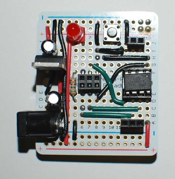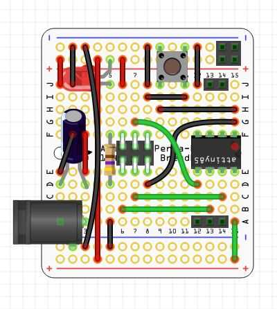 Attiny85 Pinouts: Reset 1 \/ 8 VCC 5 Volts Analog In 3, PB3 2 7 PB2, Analog In 1, I2C SCL, SPI SCK Analog In 2, PB4 3 6 PB1, PWM, SPI MISO Ground 4 5 PB0, PWM, I2C SDA, SPI MOSI<br>