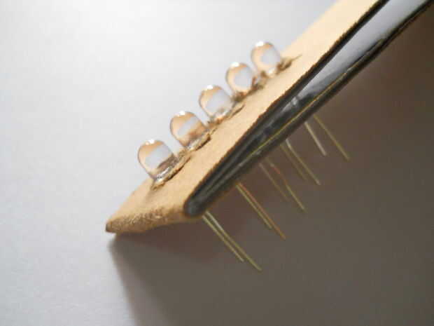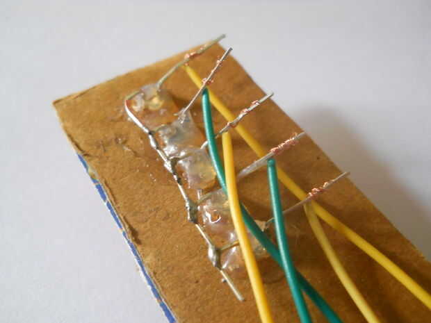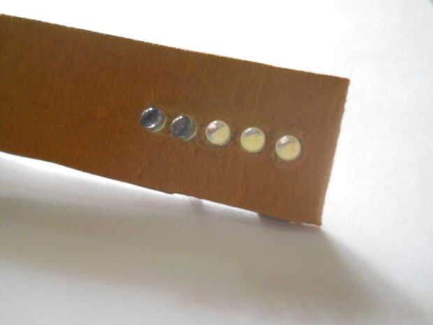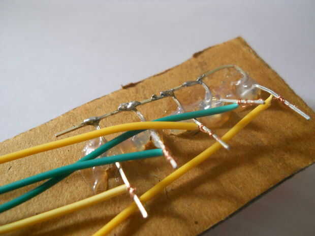 Hacer 5 agujeros en el cartón uno al lado del otro en el que los LEDs quepan en apretado. Introduzca los LEDs y conecte todos los cátodos (-) juntos forman un cátodo común dejando los ánodos por separado.