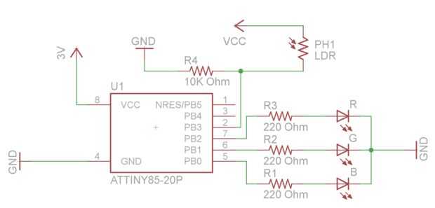 Si desea que el circuito no responde a la luz y constantemente en y descoloramiento, sólo quitar la resistencia LDR y 10K y conectar Analog Input 3 (pin 2) directamente a tierra.