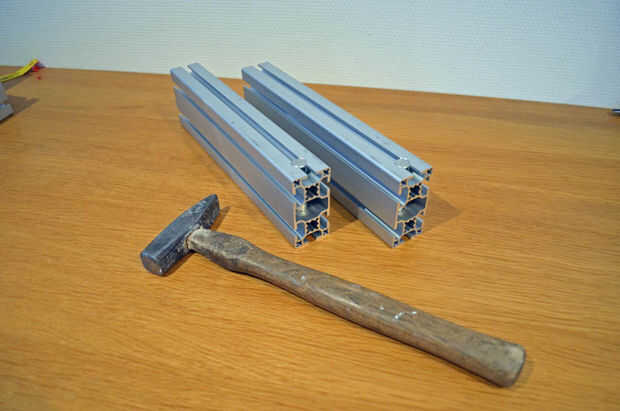Introducir los dos tacos acero en a las dos vigas de aluminio con un agujero. Estos son los perfiles largos de 300mm con un agujero de solo 14mm por cada uno de los perfiles. Puede que necesite algunas herramientas de persuasión (también conocido como martillo) para obtener. Si utiliza un martillo para persuadir el pasador de acero en el agujero en los perfiles largo 300mm, utilice un martillo de madera en orden de no para dañar los perfiles de aluminio. Asegúrese de que los orificios de la espiga de acero están en línea con la ranura en T de la viga, las espigas de acero tienen dos agujeros embutidos en cada uno de ellos. La cabeza del perno M8 especial encaja en esta recesión. Asegúrese de que el lado largo de la viga enfrenta a la parte cóncava de la espiga de acero.