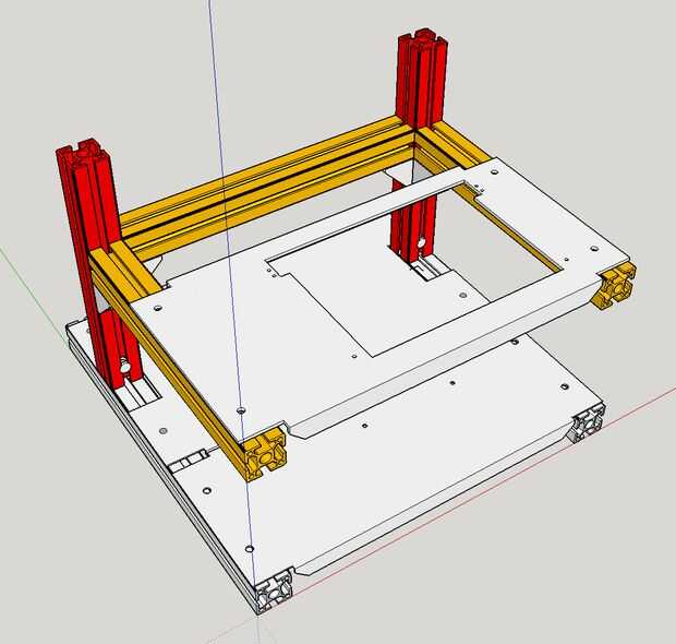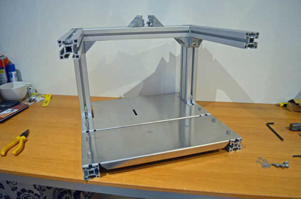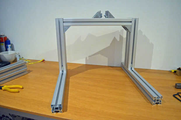 Añadir dos esquinas más y dos perfiles de 320mm apuntando hacia la parte delantera de la máquina. La placa de la cuenca de 4mm se sentará encima de estos dos haces.