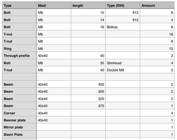 Empezar por trazar los dos perfiles de 40x40mm largo 450mm sobre una superficie plana. Tomar la placa del espejo, 4 tuercas M6 T, 4 anillos de x M6 y 4 tornillos de x M6x10. Inserte dos tuercas en T en cada perfil y conectar la placa de espejo a los perfiles. Es importante que la parte delantera de la placa del espejo quede a ras con las caras de los perfiles largo 450mm. Comprobar si la placa del espejo está orientada correctamente, de pie delante de la máquina los cuatro orificios para conectar el soporte del espejo debe ser en la parte derecha trasera.