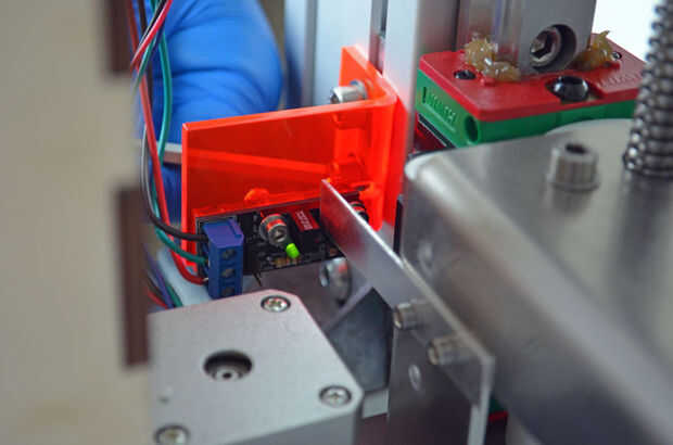 Ahora toma la Asamblea de interruptor de casa y colóquelo de modo que la parte inferior de la casa dedo en el sensor óptico. Esto debe resultar el LED en el hogar apagado. Mueva ahora el interruptor de inicio un poco más abajo hasta que el led está encendido pero atenuado. Fije el interruptor de inicio para el eje z y compruebe si el LED se atenúa aún y el dedo casa flota libremente en el interruptor. No debe existir ningún contacto entre el dedo casero y el interruptor de inicio.