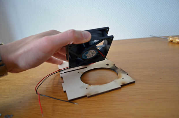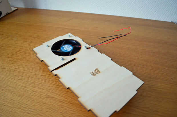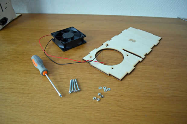 El segundo ventilador de 80mm se monta en la parte de madera B6. Usar pernos de cabeza de cilindro de cuatro M3x35, M3 arandelas y tuercas para hacerlo. Compruebe la dirección correcta del flujo del ventilador. La etiqueta del ventilador debe montarse sobre las piezas de madera. Por favor ver la foto para más detalles.