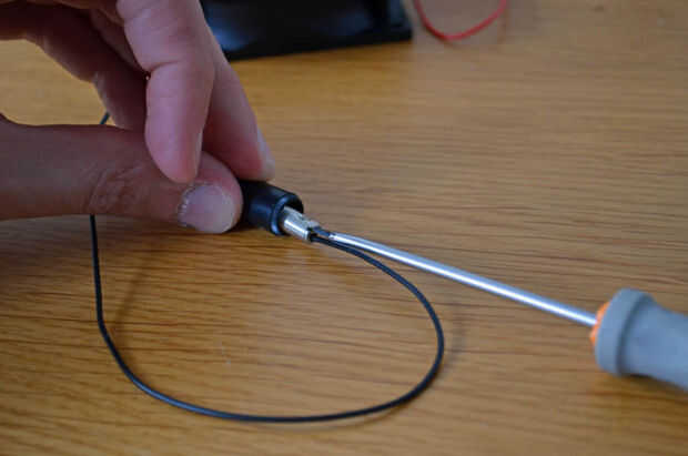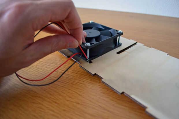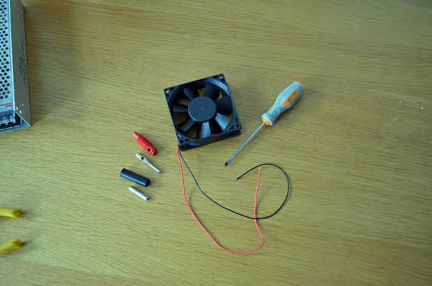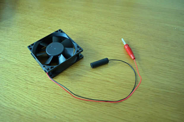 Pasemos con el conector de banana uno de los ventiladores de 80mm. Montar un conector banana macho en el cable rojo y un conector hembra en el cable negro. Por favor ver la foto para más detalles.