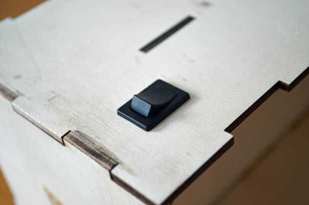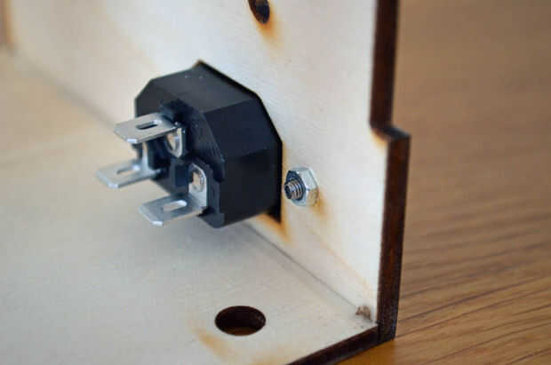 Compruebe si el pegamento está seco y (si tan) Oprima el interruptor marcha / parada en el marco de madera. Montar también la entrada de energía en su lugar con tornillos avellanados M3x10 con arandelas y tuercas.