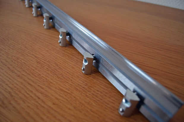 - Insertar seis (estándar de la máquina) o diez (máquina XL) M6 tuercas en T en el lado hacia arriba de la viga.