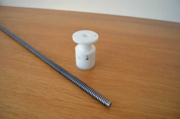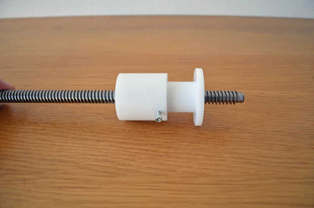 Ambas partes blancas tienen un grueso TR12 que agarra en el huso del hilo de rosca. Se aferran uno al otro usando el hilo de rosca fino. Girando uno en relación a los otros usted puede variar la distancia entre los dos extremos del hilo de rosca grueso. Para enroscar la tuerca completa en el eje de que este espacio debe ser justo.