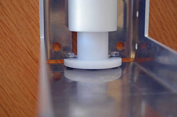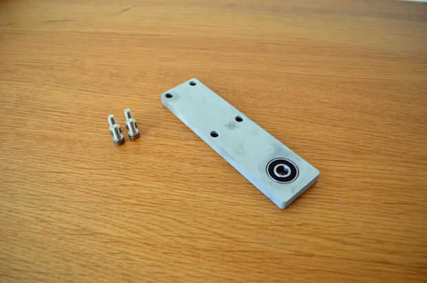 Introducir un 26 x 9 x 8 rodamientos de bolas en la placa inferior de aluminio e introducir el "fondo" del huso a través del cojinete. Este extremo del huso debe venir todo el camino a través de la placa inferior.