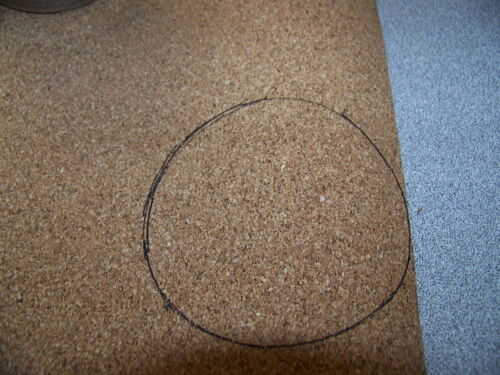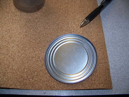 Ahora, tenemos que estirar algunos de corcho y trazar la lata tapa en él. Asegúrese de colocar la lata tapa lado derecho hacia arriba y trazar la parte inferior de la misma con su pluma. Remontamos la parte inferior, así que el corcho se ajusta hacia abajo dentro de la parte superior de la tapa. Una vez que lo tienes trazado, corte el círculo sólo dentro de la línea. Terminé con las tijeras para esto, pero si quieres usar el cuchillo, se puede. Ten cuidado. Pruebe la colocación del corcho en la parte superior de la lata tapa. Si algo no encaja bien, recortar un poco y vuelva a intentarlo. Una vez que cabe agradable, podemos pasar el siguiente paso.