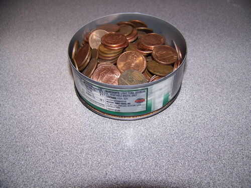 Ahora, conjunto el atún puede lleno de monedas en la parte superior del corcho!