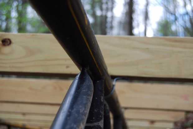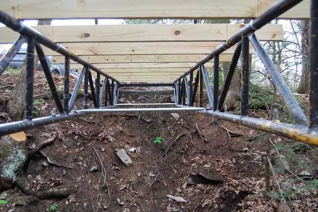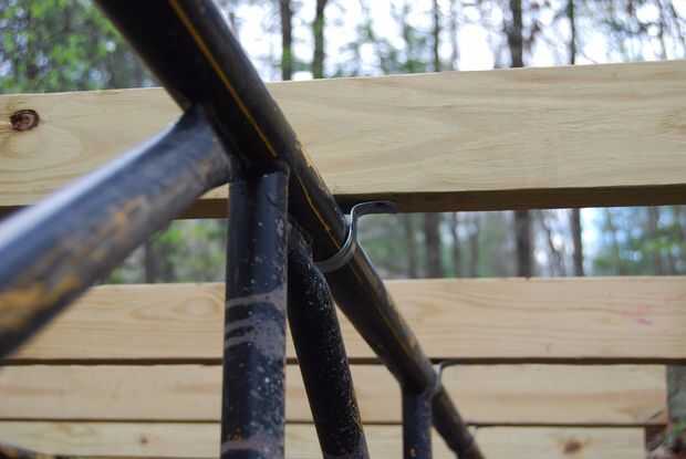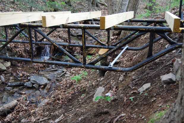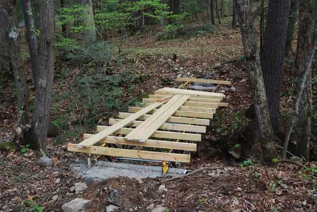 Presión corte tratadas 2 x 4 a 5' longitudes y hacer una marca de 1' en de cada lado. Las marcas indicará dónde alinear el 2 x 4 cuando se unen a la armadura. Colocar todos los largueros resultados un poco difíciles basada en la altura del puente. Acabé de apilar todos los 2 x 4 en las cerchas y corrio a través del puente instalar los listones uno por uno. Esto era probablemente más interesante para ver, pero funcionó bien. Nota que algunos de los largueros se espacian un poco más cerca juntos como resultado de la vertical soporta interfiriendo con las abrazaderas de conducto.
