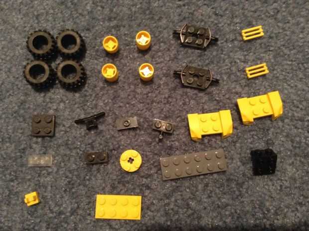 Parte cuatro llantas grandes (superior izquierda a inferior derecha), cuatro ruedas grandes, dos placas de eje baja, parrilla de dos piezas, una placa de dos en dos, un manillar, dos-por-uno con un solo perno en la parte superior, un dos por uno con un peg hacia arriba, dos de dos en dos piezas de la cubierta de la placa translúcida dos-por-uno, una placa de dos por uno, una placa circular de dos en dos, una placa de dos por seis, una placa de dos por uno con una placa lateral de dos en dos de la rueda , una hacia arriba de una por una abrazadera y por último una placa quitase