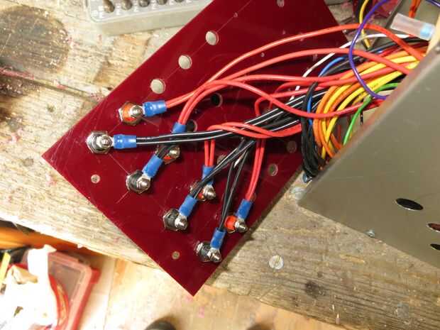 So. tira de unos 5-7mm del extremo de cada cable y que encajen con un terminal de presión de anillo pequeño. Coloque un cable negro más fino adicional en 2 de los pares negros y un cable rojo más fino adicional en uno de los pares rojo. También añadir un extra de grosor total cables un par de 12v y un par de 5v. Éstos deben ser lo suficientemente largos para alcanzar el interruptor y LED, conexión USB y reguladores de KIS3R33. Los pares más ir a las terminales más alejado donde los cables salen de la fuente de alimentación. Ajuste cada terminal a un poste terminal de anillo, pero no apretar las tuercas todavía, porque los cables deben ser capaces de moverse un poco mientras trabajas en él. También les hace fáciles de deshacer si desea cambiar las cosas o quitar el panel. Si los tienes también es buena idea colocar una arandela antivibración entre el anillo y la tuerca superior