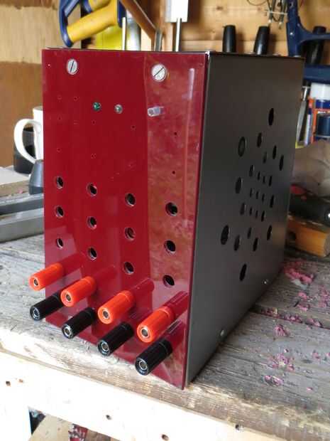 Perfore pequeños agujeros en el panel antes de perforar los agujeros de tamaño completo para los terminales. Esto asegura un posicionamiento más preciso. Todos los taladros "pasee" antes de morder en el material a perforar y taladros más grandes vagan más. Un agujero piloto asegura que no pueden hacer esto. Los orificios deben 7mm para estos terminales particulares. Idealmente, ya que los puestos tienen caras planas en la parte roscada, los agujeros sería oval para parar los puestos de poder hacer (tal vez 5,5 mm a través de los planos), sin embargo me alegré al llano los redondos del taladro.