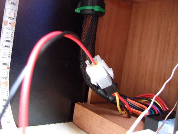 El poder está llegando de la ATX 4 pin. Uso de 12v sólo. y abajo a 9 voltios para funcionar el amplificador LM 2596 / voltímetro. No conectar aún. La espera de una desviación.