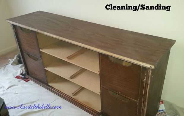 Después de rellenar los arañazos y el relleno se seque después usé mi lijadora de 2 amp pad Ryobi para quitar lo suficiente del brillo de la madera. He despojado de madera a su estado natural y es muy lento. Me parece lijarlo justo lo suficiente como para crear una superficie áspera que la cartilla para pegar. Utilicé papel de grano arena 120 con mi lijadora y también utilizar hojas a mano arena los cajones y puertas de los armarios. Nada extenso, recuerde, desea la cartilla para adherirse a la superficie. Limpie la pieza con su aspiradora para quitar el polvo. Para un acabado liso es importante limpiar la superficie antes de la imprimación y pintura.