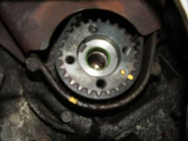 Paso 14: Vuelva a instalar el engranaje del árbol de levas, asegurándose de que está alineado con las marcas. Verificar que el cranshaft también está alineado con las marcas de sincronización. te darás cuenta cómo el marcador de la pintura ha hecho la vida un poco más fácil