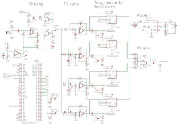 El circuito para el audífono debe lograr varias tareas claves. Primero tiene que amplificar la señal de micrófono a un nivel lo suficientemente grande como para ser procesado por el resto del circuito. A continuación la señal tiene que pasar a través de un conjunto de filtros para dividir la señal en cuatro bandas audio nivel estimado y luego a escala individual. Finalmente las bandas deben ser recombinadas y enviadas a un par de auriculares. El Arduino Lee los niveles de cada banda y escala adecuadamente las bandas.