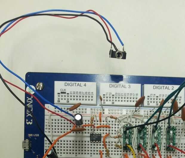 Las señales filtradas pasan entonces a amplificadores op control digital. Estos fueron seleccionados para que la ganancia podría cambiar activamente para responder a las necesidades atentos del usuario así como la variabilidad de las señales entrantes. Los amplificadores op reciben una señal de tres bits de la Arduino correspondiente a un ajuste de ganancia. La señal es amplificada y luego pasa al amplificador sumador. El amplificador sumador simplemente sumas las cuatro señales en aumento de la unidad. Si la señal parece atenuada, elevando la ganancia aquí es una posibilidad. Consulte