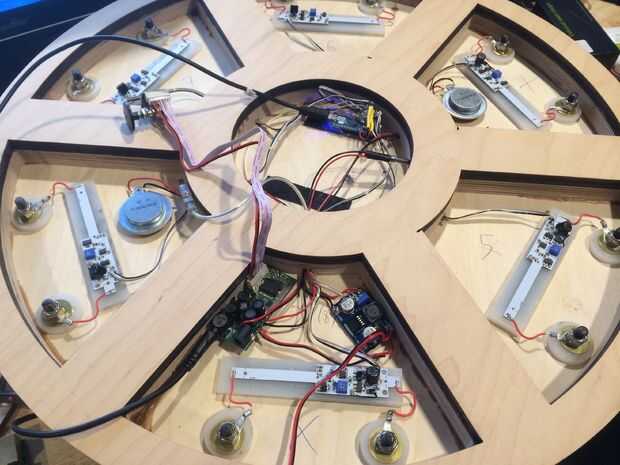 Se me ocurrió en el último minuto que los Windchimes que tiene ser que una instalación totalmente autosuficiente les sería más fácil para la galería de exhibición, y que no sería demasiado difícil de integrar altavoces en la obra de arte. Pues efectivamente es un gran bloque de madera, un par de transductores superficiales debe ser capaces de hacerla resonar mientras ocupando muy poco espacio.