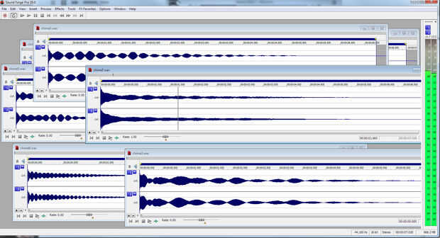 Usar mi grabadora de campo ZOOM H4 handy (y bastante destruida), había pulsado cada campana con un bloque de madera en secuencia y soltó el anillo de tono. Entonces tomé la grabación en Sound Forge, dividirlo en las muestras separadas, ajustar volumen constante a través de todos los 8 sonidos y recorta cualquier espacio muerto. En algunos de ellos, usé una compresión suave para reducir el pico de ataque original donde la madera golpea la campana para evitar estallido sonidos más adelante en el proceso.