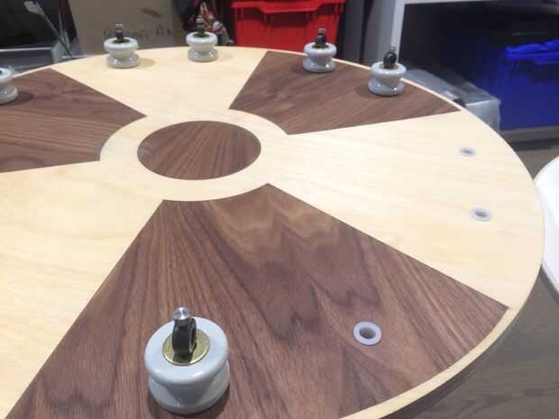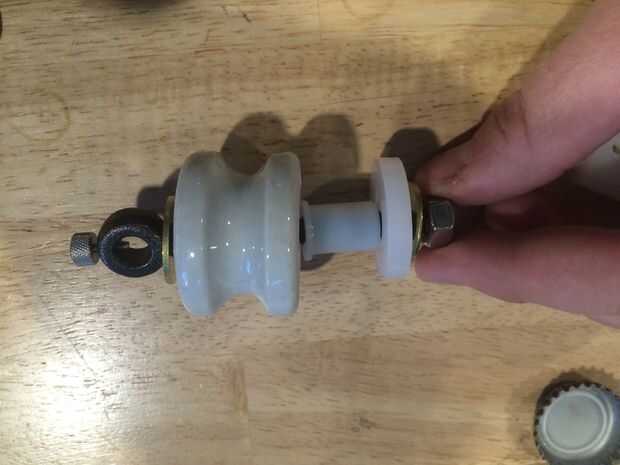 Para montar los tubos de Geiger en la cara de la pieza de madera deben ser aislados por un material relativamente no conductores. Opté por usar los aisladores de cerámica encontrados generalmente en cercas eléctricas con un conjunto de tornillo de mariposa casera para mantener el tubo en su lugar.