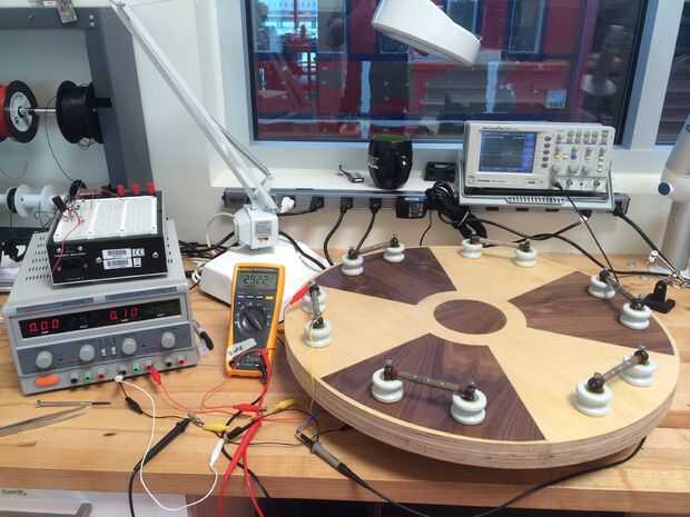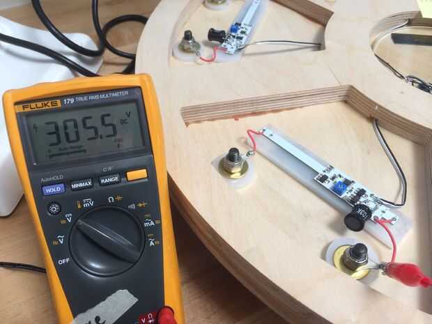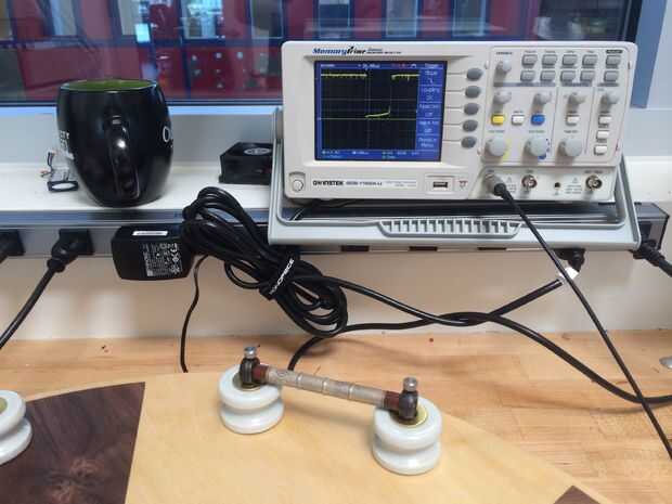 A continuación llevé todo el asunto hasta el laboratorio de electrónica para revisar el circuito y la instalación. La unidad PCB dispone de potenciómetros de ajuste para ajustar la tensión de salida, así que ajusté todos los de la Junta a aproximadamente 300VDC. También poner una punta de prueba del alcance de cada una de las salidas de PCB y verificado que fueron todos detección de partículas (se puede ver el pulso negativo en el rastro de alcance indicando un evento de detección).