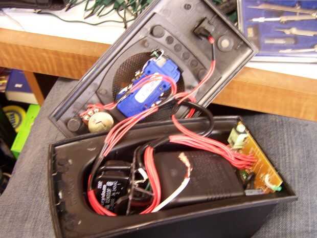 Además, no se olvide de ejecutar corriente del transformador fuente para la placa de circuito. En mi caso esto significa envolver el cable sobrante y acabando un poco corto de él el puerto bajo en la parte posterior del altavoz de la vivienda a la ubicación original del enchufe eléctrico.