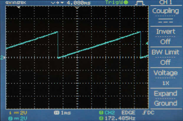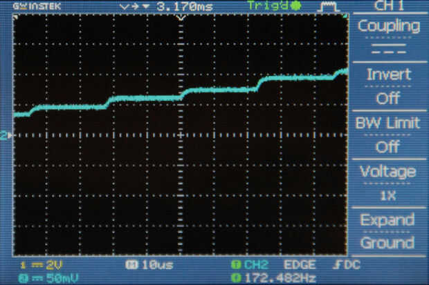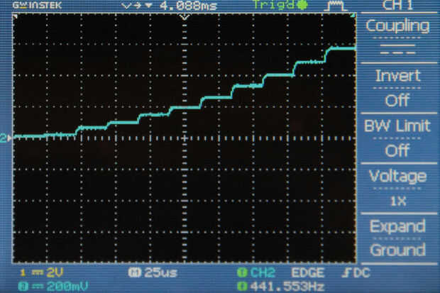 Figura 8 muestra que un zoom a la vista de la DAC vieron salida en un osciloscopio. Se puede ver el 22.6us individual pasos de la onda, tan calculada. El período de la onda (la longitud de la sierra completa un ciclo) es: