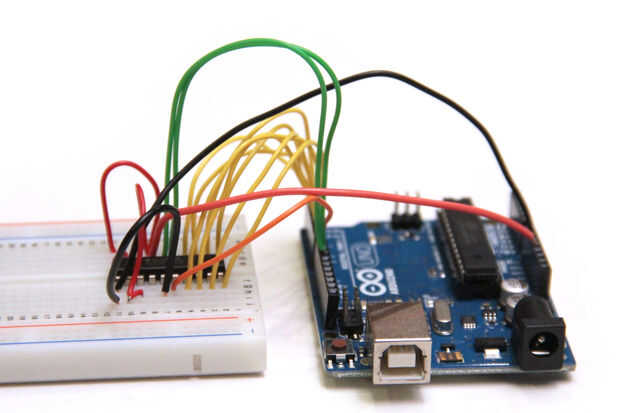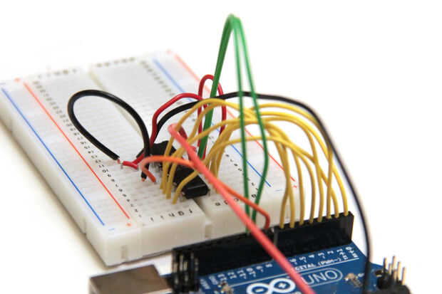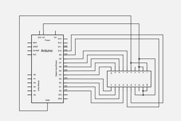 El diagrama esquemático para la configuración del CAD se muestra en la figura 2. AGND y DGND (pines 1 y 5) conectan a masa de Arduino. VDD (pin 17), OUTA (pin 2), número (pin 20). RFBA (pin 3) y RFBB (pin 19) conectan a 5V de Arduino. WR (pin 16) se conecta al pin digital 10 CS (pin 15) se conecta al pin digital 9 y DACA/DACB (pin 6) se conecta al pin digital 8. DB0-DB7 (pines 14-7) conectar a los pines digitales 0-7. Las salidas de la DAC son pernos 4 (DACA) y 18 (DACB).